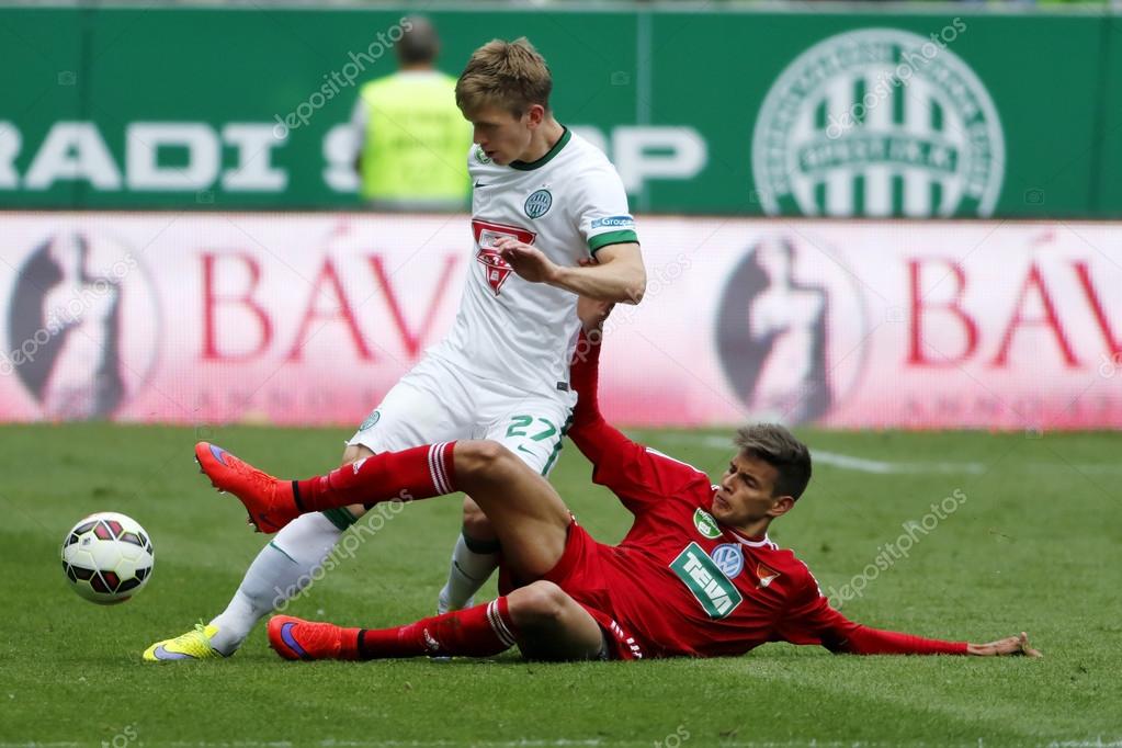 Dvsc / Budapest Hungary 25th November 2017 Justin Mengolo L Of Dvsc Leaves Vit Benes R Of Vasas Fc Behind During The Hungarian Otp Bank Liga Match Between Vasas Fc And Dvsc At Ferenc